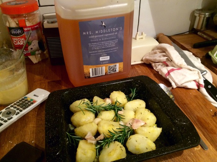 And those wonderful roasties.. Red king Edwards boiled and cooled.. Then anointed with Mrs Middletons straight up oil.. Garden Rosemary and smuggled French garlic..