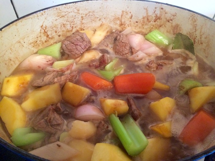 A simple stew of chopped and browned chunks of the veal topside, with parsnips, carrots, swede and celery .. Topped with water and herbs..