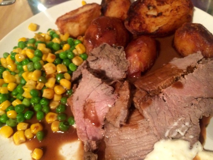And buttered peas and jolly green giant corn.. A drop of horseradish and some leftover gravy.,