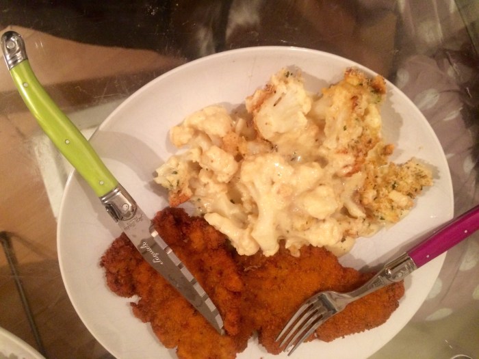 Rose Veal schnitzel , cauliflower cheese and root mash