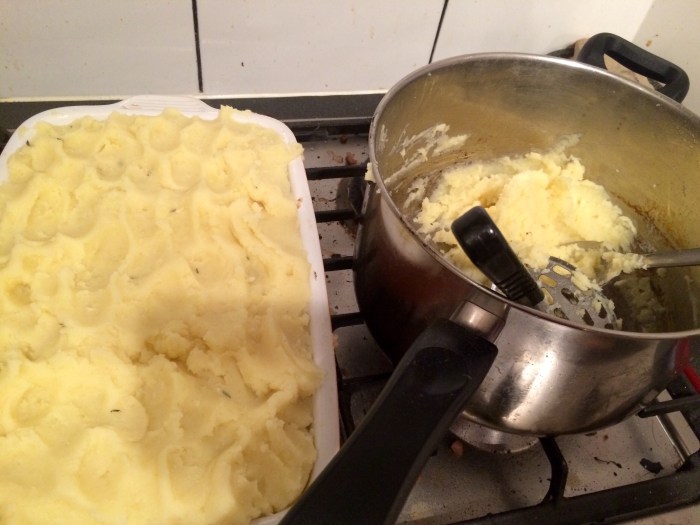 Parsnips and potatoes boiled and mashed with salt, white pepper and butter .. The root mix dolloped atop of the cooled meat..