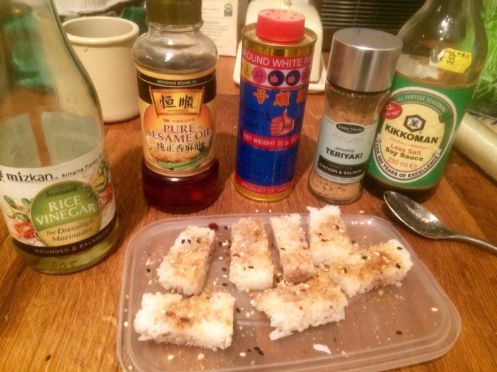 The rice cubes made by stealing some of the hounds rice that was sticky from the rice cooker.. Wrapping it tight in cling wrap and fridging it.. Then seasoned with all these things!