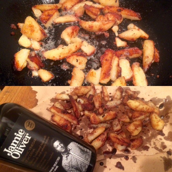 They were just crisped and warmed in the pan .. And some chips of course! leftover steamed red potatoes chopped, fried in straight up Mrs Middletons and pimped with velvety balsamic.