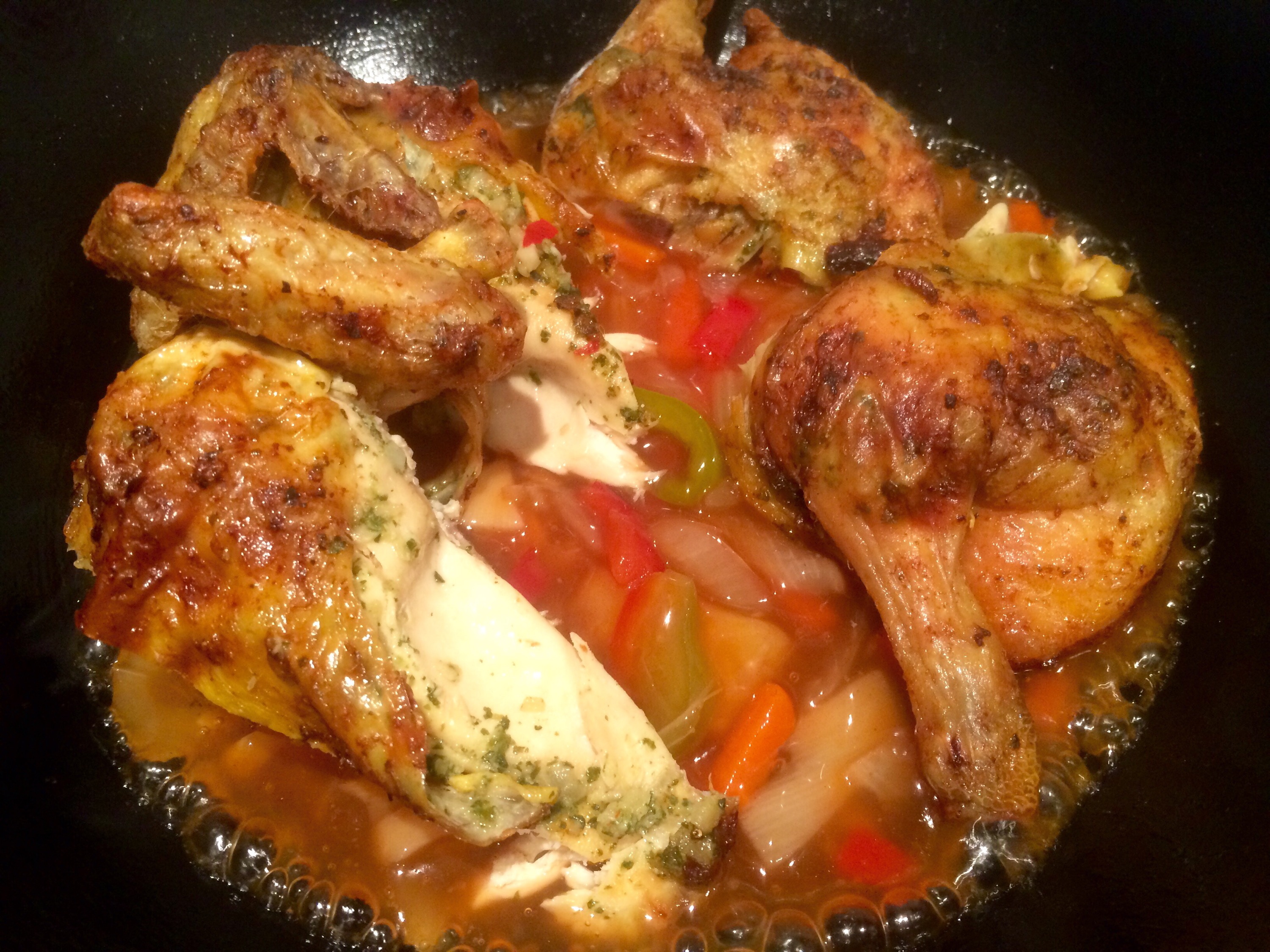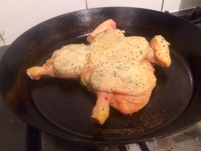Snipping out the back bone from this tiny bird .. Making a butter mix of Thai bits and butter.. Leveraging the skin away from the bird gently and smudging it with the butter..