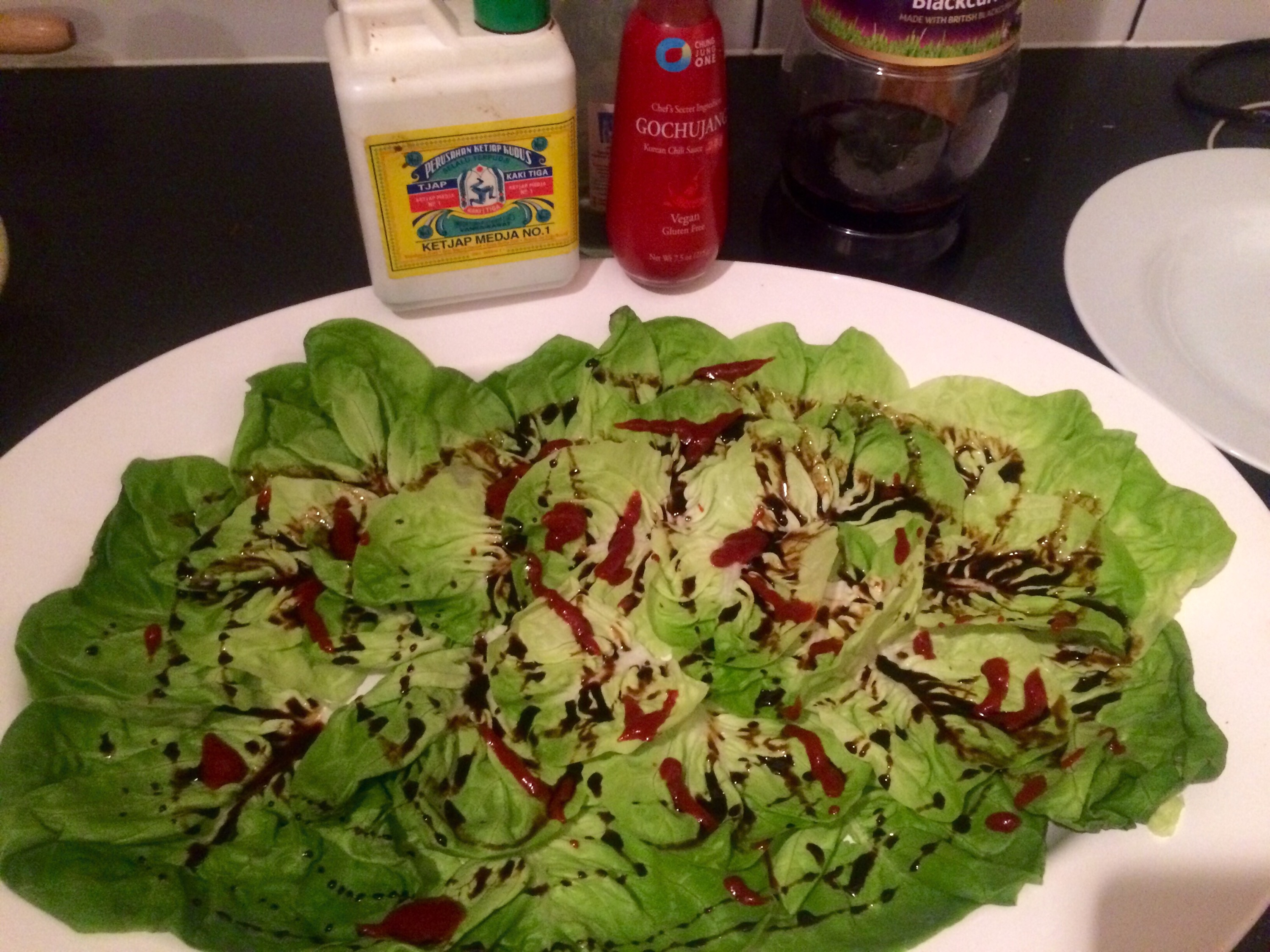 Take a butter lettuce and lay all the leaves out perhaps? Squidiling done Korean chilli sauce and some ketjap manis? Yeah good start..