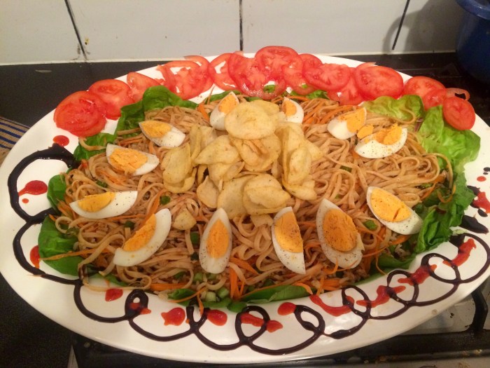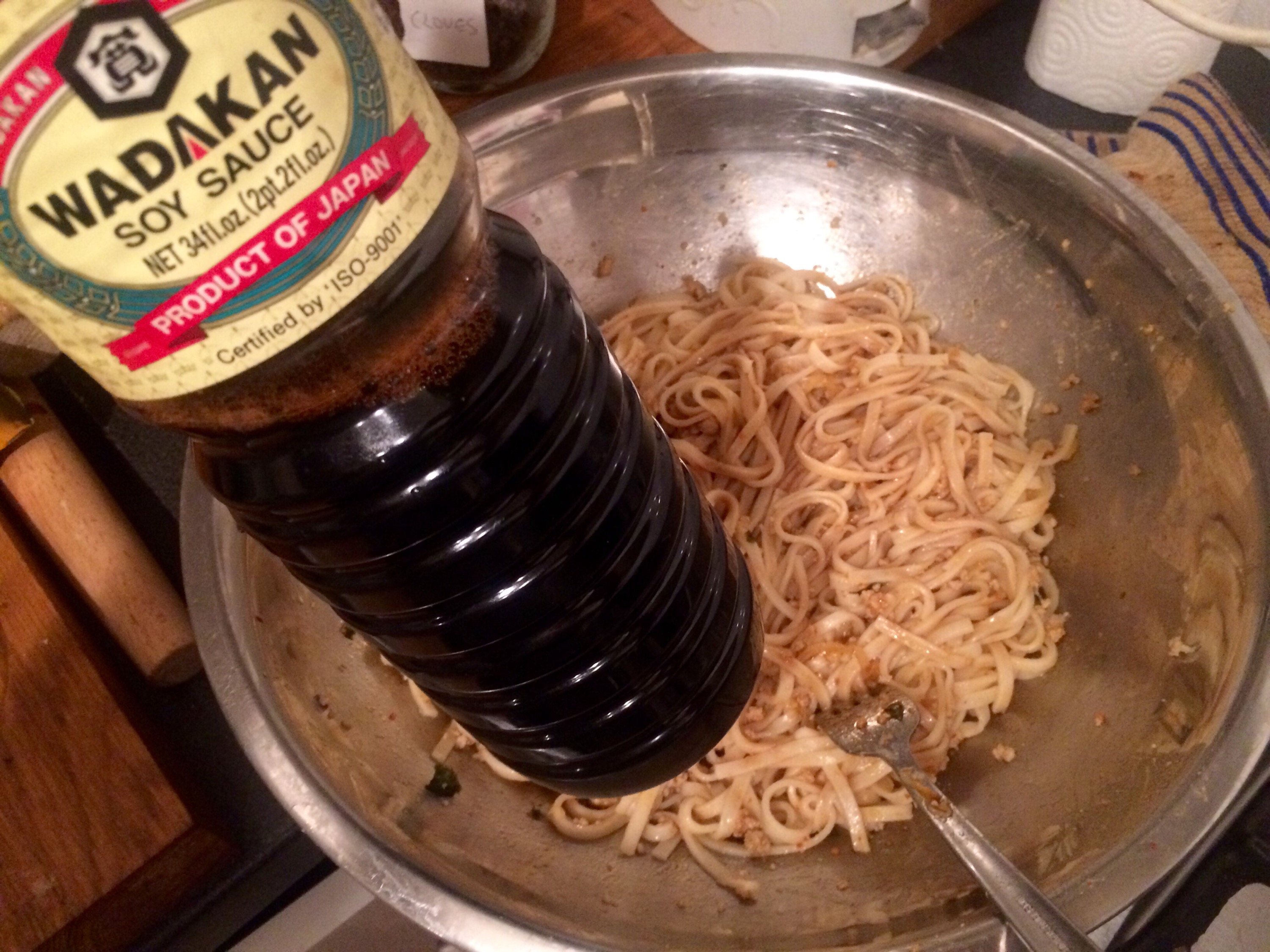 Heat the Laab and mix with the rinsed noodles ? Yes good plan ! Sprinkle with some Japanese soy sauce? Now we are talking!