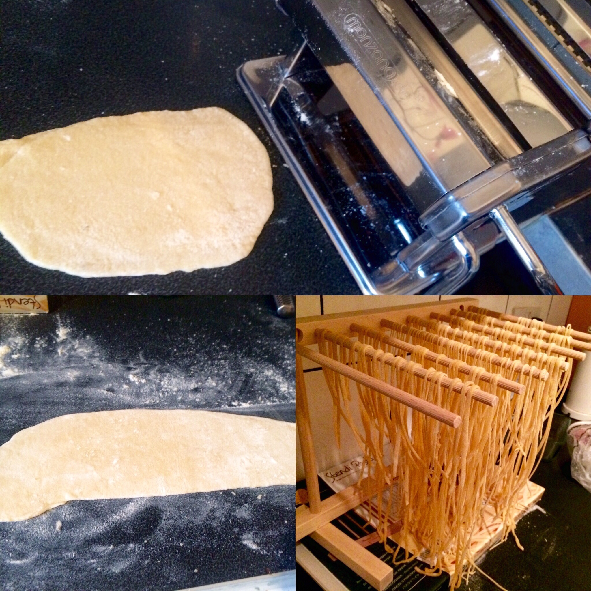 Into cut pieces.. Flattened and dusted with flour.. Rolled through the machine on the number one setting.. about four times.. then moving the notches I tried a few up to notch ‘5’.. Best on 3 I think.. It then goes through the cutter bit.. and hung on the dryer..