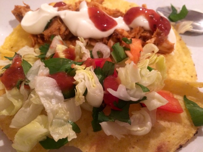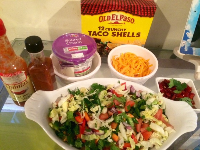 A chopped salad of crunchy iceberg lettuce, hard Dutch tomatoes, red onion, coriander and red and green hothouse peppers.. Sour cream at the ready and some red cheese for Mrs Fitz .. The corn shells are very good from @oldelpasouk #oldelpaso Chefping knocks them outta the machine in under a minute..