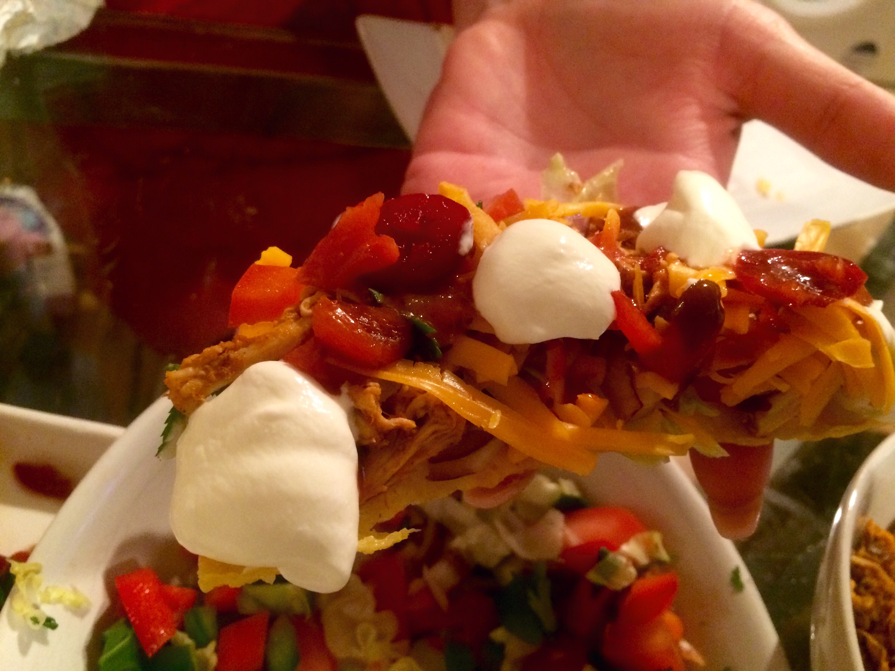 A chopped salad of crunchy iceberg lettuce, hard Dutch tomatoes, red onion, coriander and red and green hothouse peppers.. Sour cream at the ready and some red cheese for Mrs Fitz .. The corn shells are very good from @oldelpasouk #oldelpaso Chefping knocks them outta the machine in under a minute..