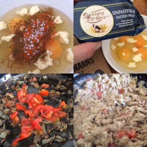 Starting with a brunch of masala eggs.. Frying some onion.. Adding some chopped baby tomatoes.. Adding great butter, chilli and garam masala.. Then making up the scrambled eggs.. Tasty tasty tasty!