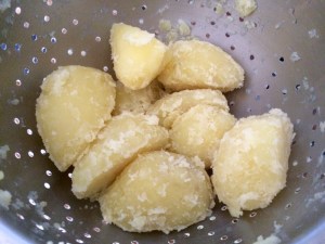 Simply roasted off after being seriously seasoned.. Hot oven then down.. The peeled and slightly boiled and shaken up in the colander pitied sit underneath in a big piping hot puddle of goose fat.. (Remember ruffles and scruffles mean super crispy)..