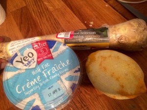 Horseradish sauce by grating fresh red ticket horse radish root and mixing with Creme fraiche, lemon juice and salt and pepper.. Stunning!