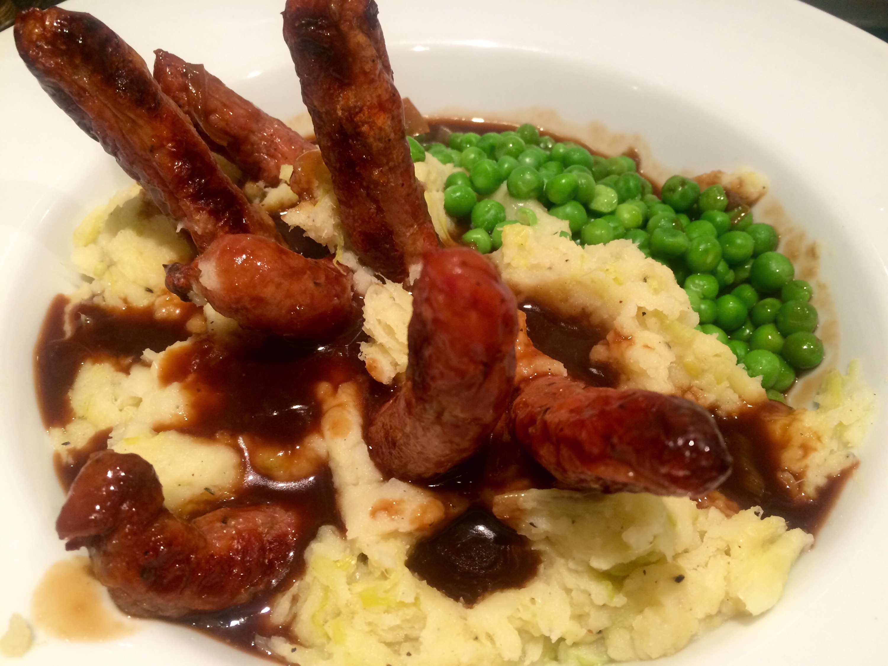 #blythburgh bangers with Dijon leek and potato mash, peas and bistogravy #comfortfood #powerdownfordinner