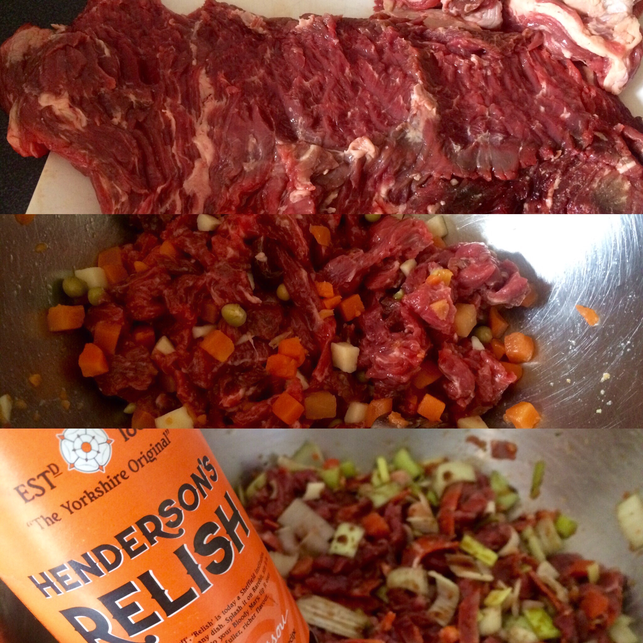 Chopped skirt mixed with a can of mixed veg, you know the ones? the one with carrots peas and potato all chopped and mixed .. great for this kind of cooking.. an extra bit of chopped leek too .. Some chopped up chorizo also..