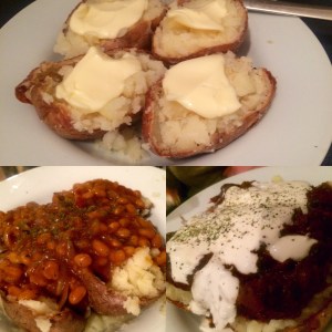 The potatoes are simply stabbed up , rubbed with olive oil and dusted with fine salt. baked all the way through.. no chef ping intervention this time around.. and no double stuffing, we are going old school..