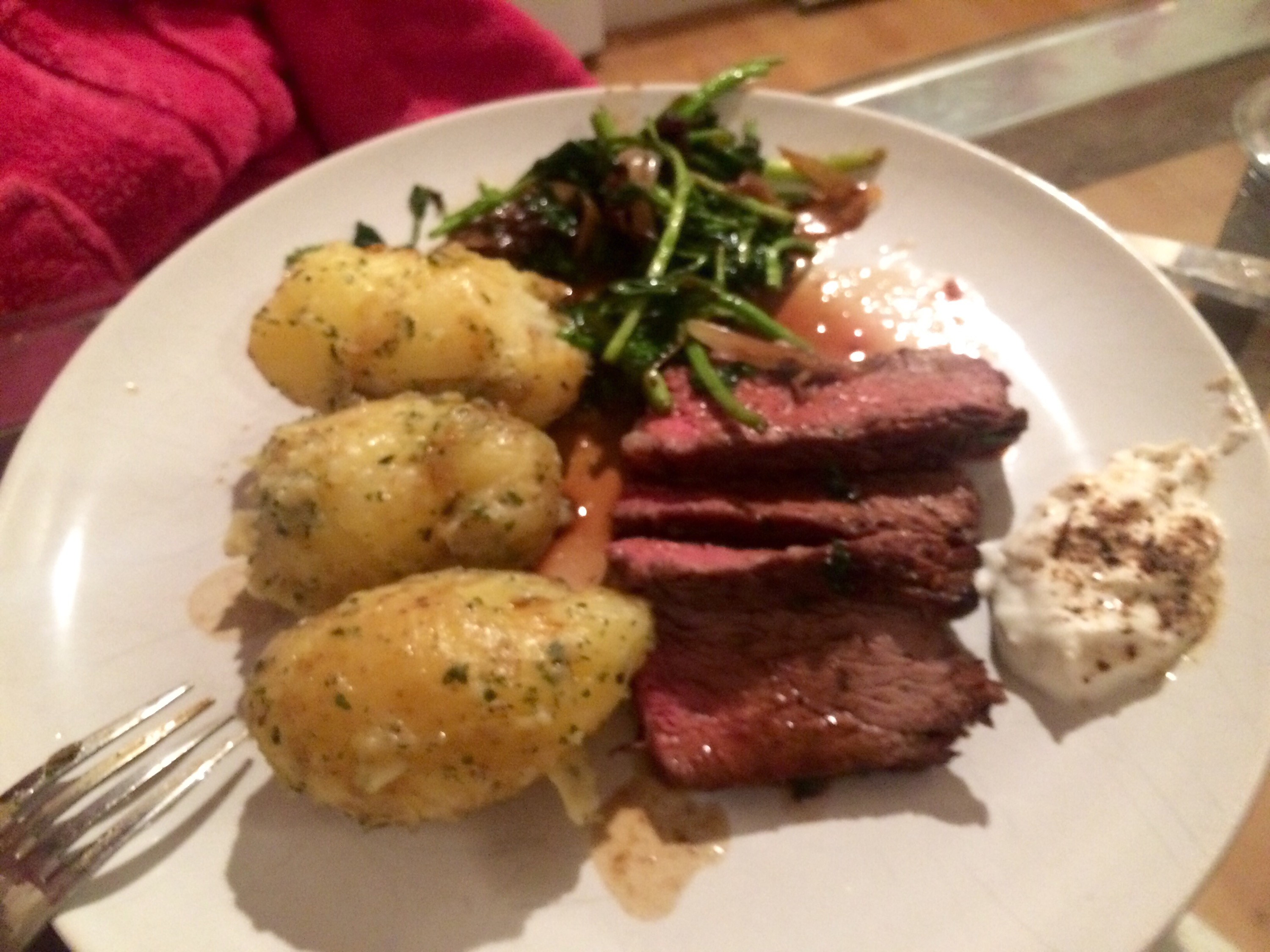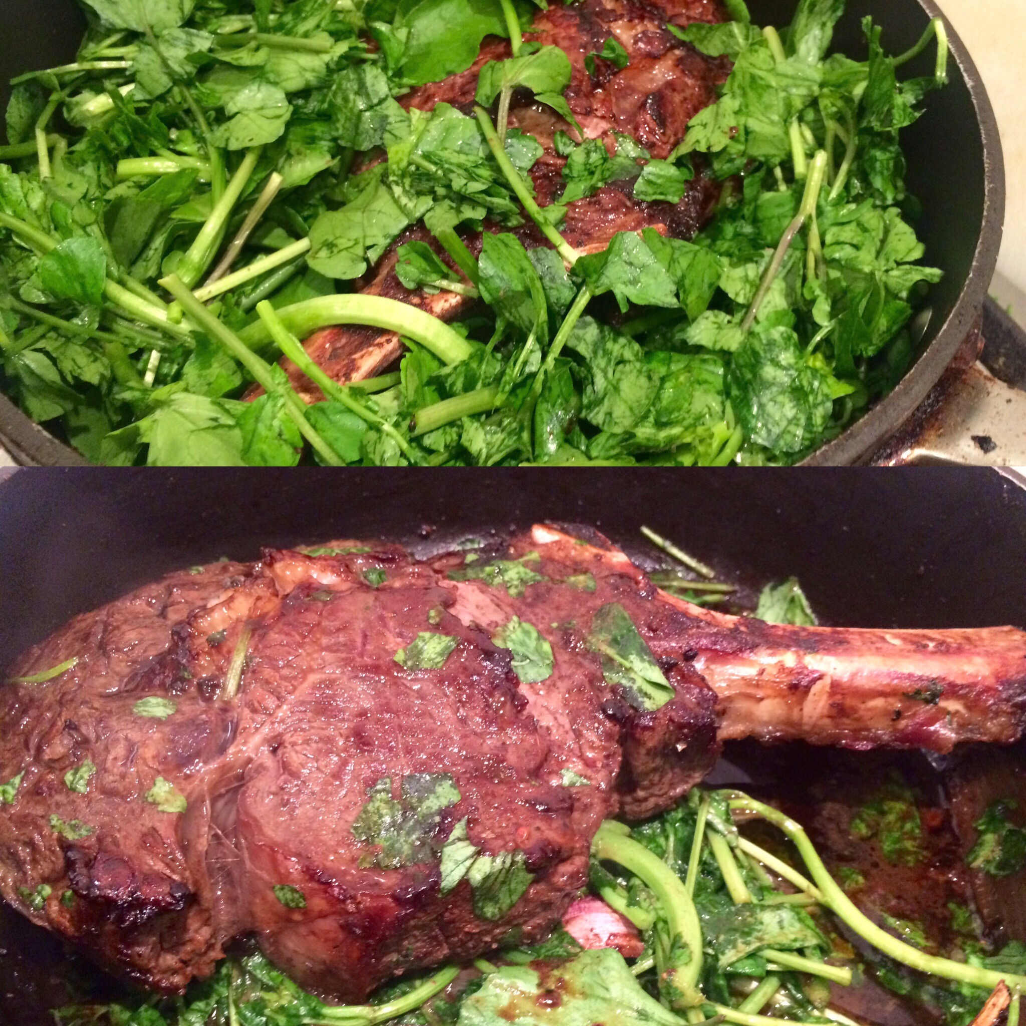 The cote de boeuf is out.. The watercress added to the pan to wilt with the heat of the meat