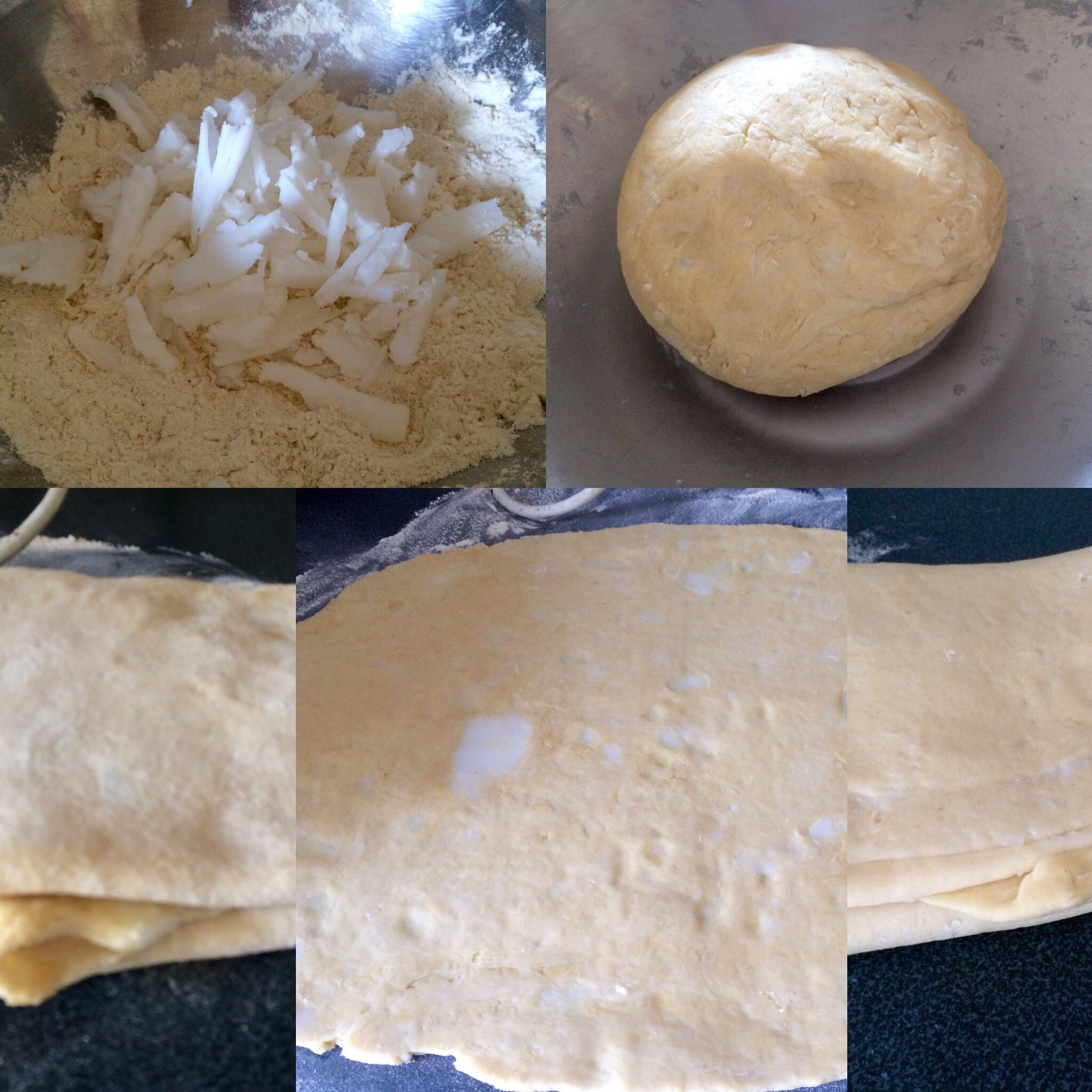 First the pastry.. Plain flour and some strong French bread flour.. butter rubbed in.. Then loads of shredded beef dripping.. Some salt and water to form a dough.. Left a while.. Then the rough puff part..