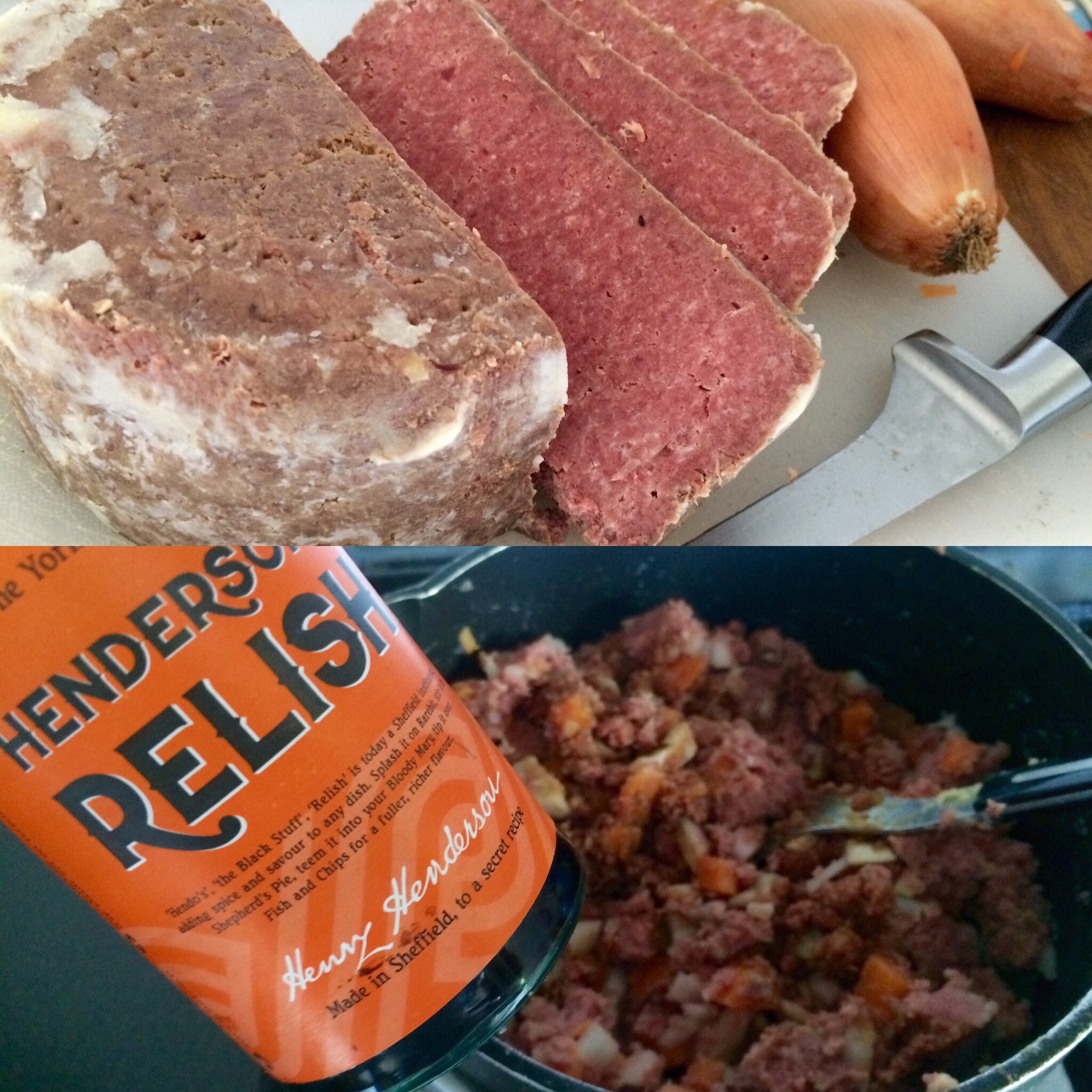 A little potato and carrot booked up and diced.. Some chopped banana shallot too.. And all with a shake of #hendos Hendersons relish.. It’s like Worcestershire sauce in a way..