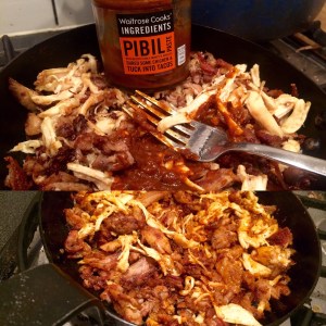 This outing used up some more of that wonderful spit roast free range pork stored in the inside freezer.. And also some pulled rotisserie free range chicken. Simply fried up with some pibil paste..