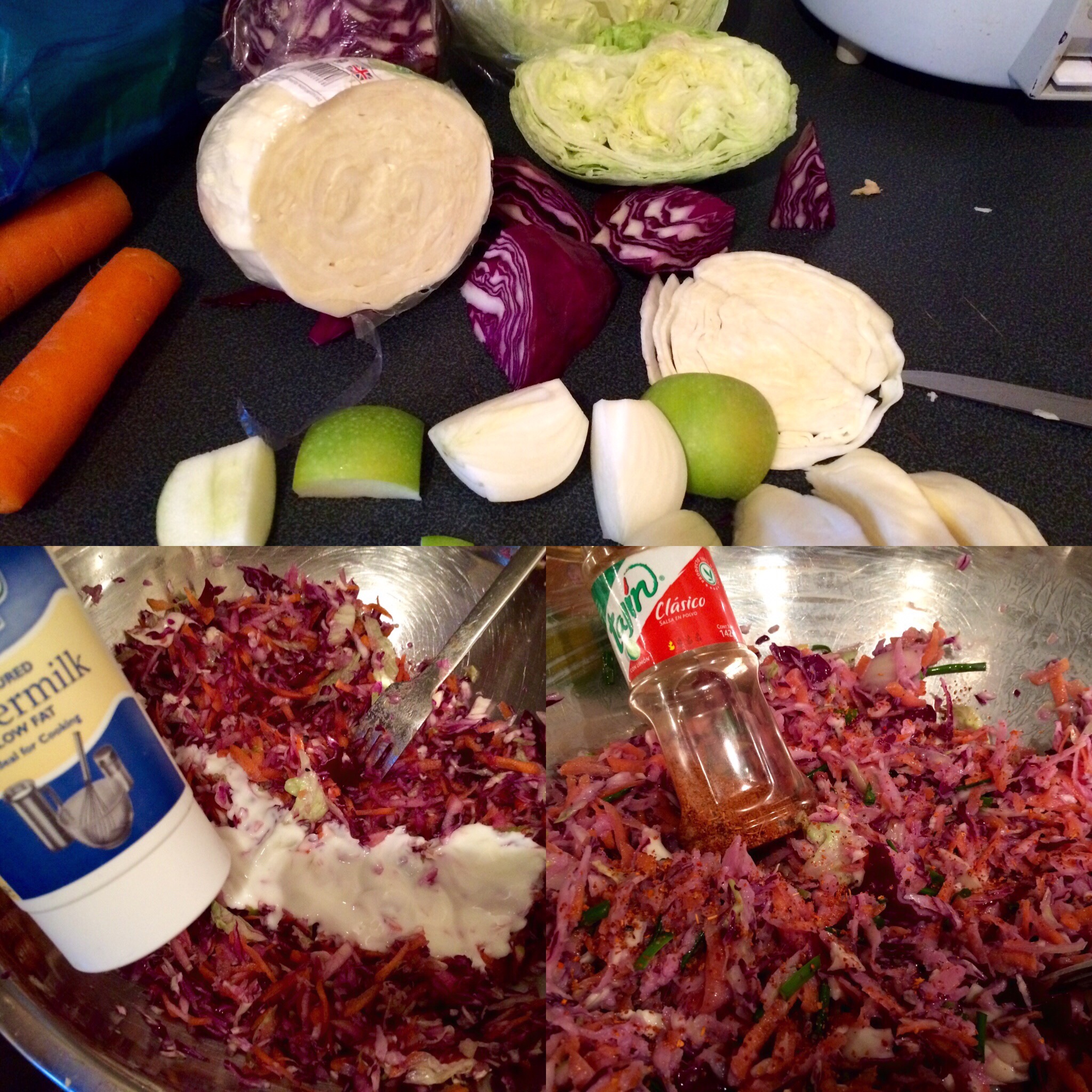 The slaw is using red cabbage, white cabbage, iceberg lettuce, carrot and white onion.. Then hand shredded on then box grater..