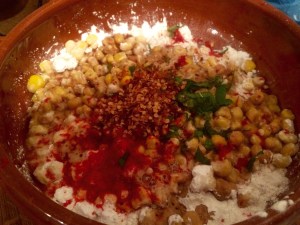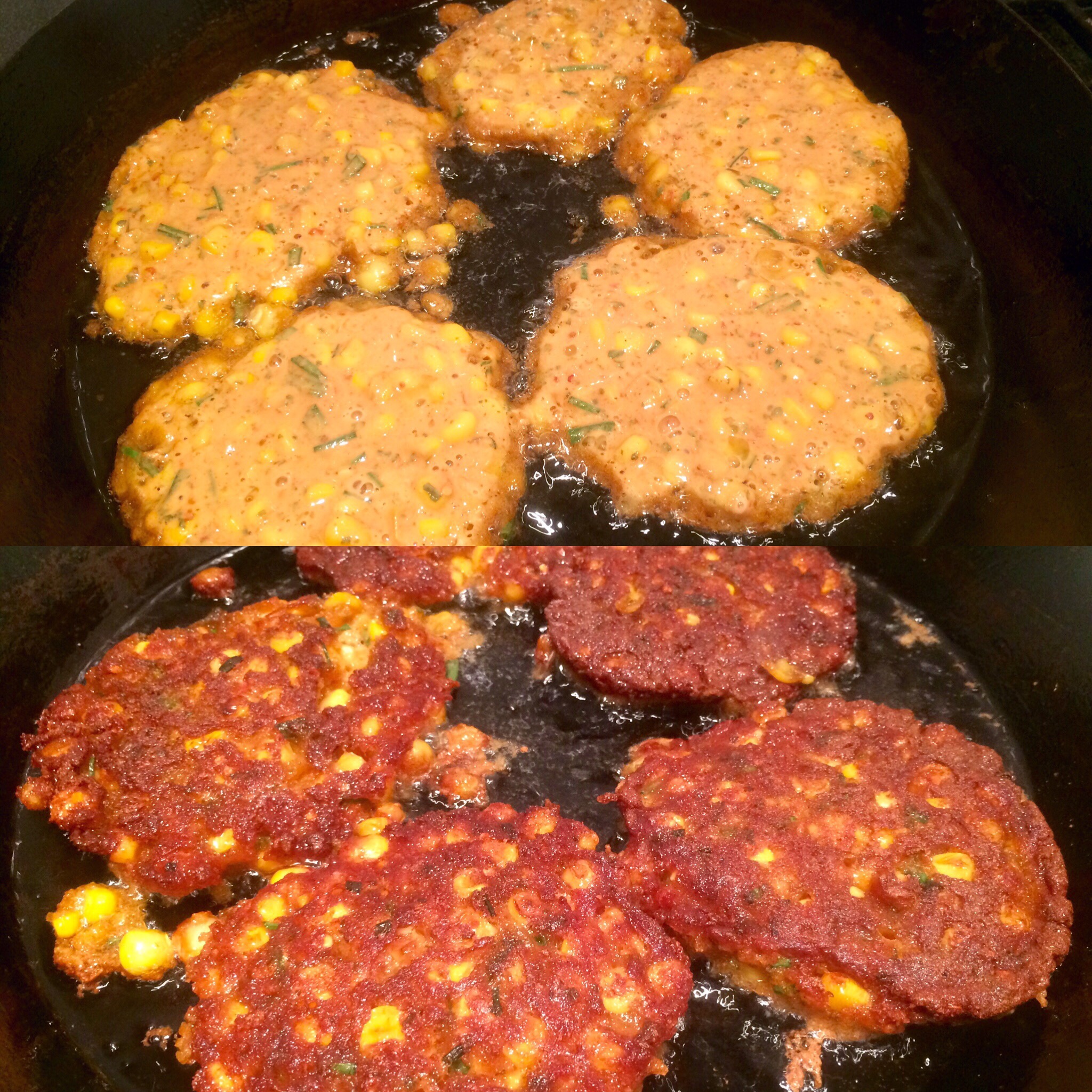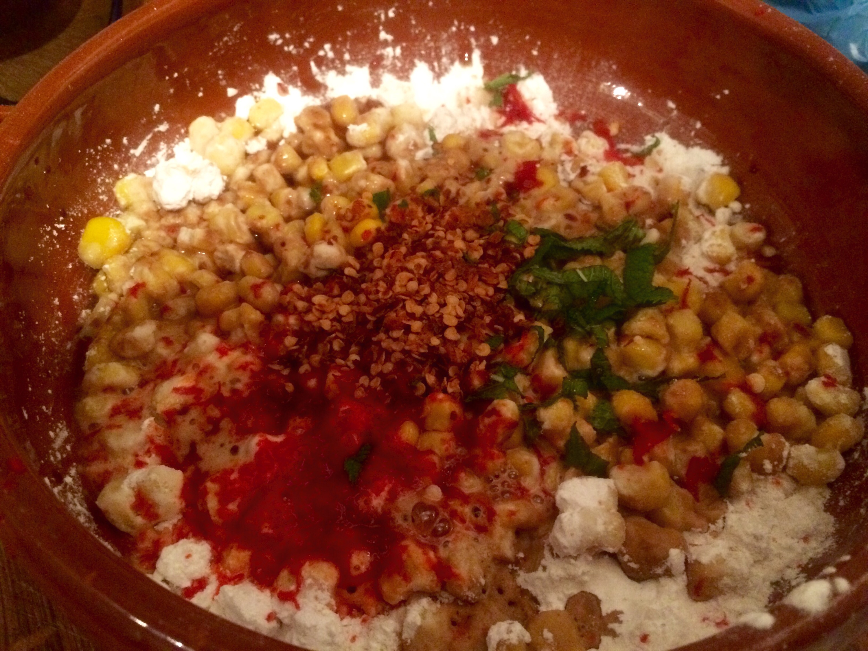 #jollygreengiant sweet corn added into a batter of cornflour, maseca flour, and a little French baguette flour.. with chopped chilli and chilli flakes.. ( ummm far too many these were hot hot hot!).. Some smoked mild paprika and salt and pepper …