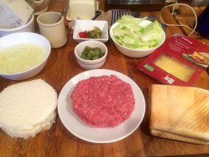 Burger station layed out.. chilli gherkins for Mrs Fitz, crunchy iceberg lettuce , sliced brown onions let to steep in a sugar and salt reverse osmosis water to take the eye cry bite out of them.. Mixed jalapeños and jarlsberg cheese ( again for Mrs Fitz)..
