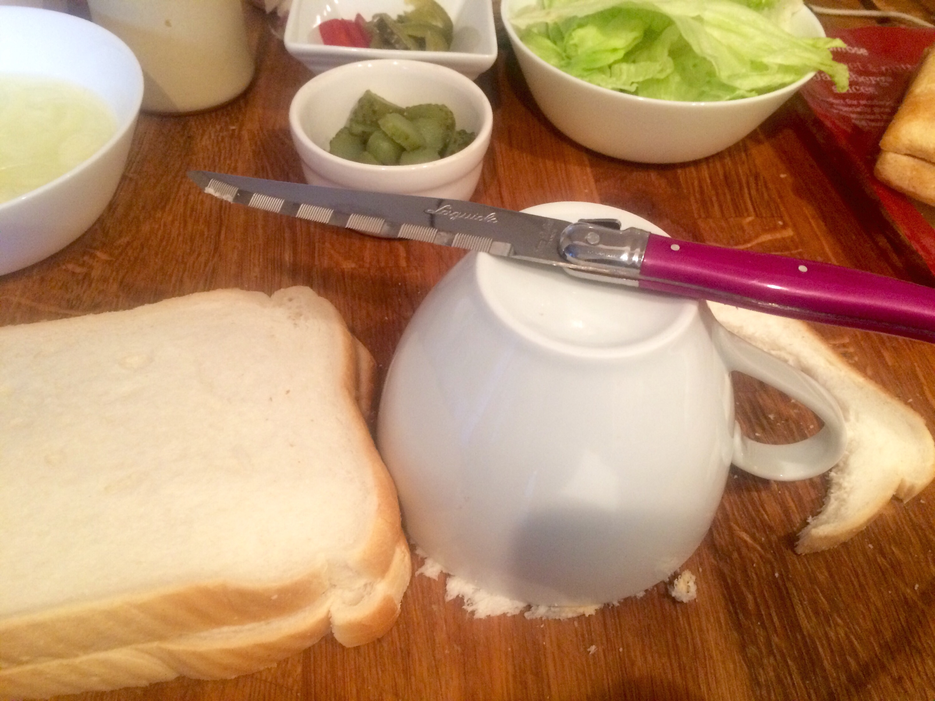 Pop a teacup ontop of thick white sliced.. And cut around it.. Simple right?