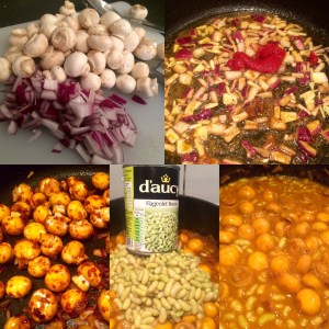 Then in go the button mushrooms , the smaller the better.. Some reverse osmosis water added.. Lid on.. Lid off.. Let it bubble away.. Then add the flageolet beans.. Excellent ones these French numbers.. I like the whole range this company does.. The water from the can in also.. And boil up till its reduced and thick.. If the beans are going too mushy.. just strain the lot and add some juices back in..