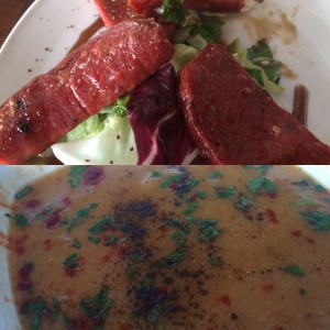 I kinda wished that we could have just had a mixed mezze for the starters.. Yet nope we had to choose.. So being good pals and knowing that we could taste from each other’s plates we went for the soup ‘lachana’ and the sujuk.. (Turkish sausage and quite a fave of mine!)..