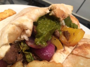 Skewered up and seared till a little char develops.. Into warmed olive oil enriched pitta breads.. With crinkle chips dusted with oregano and salt..