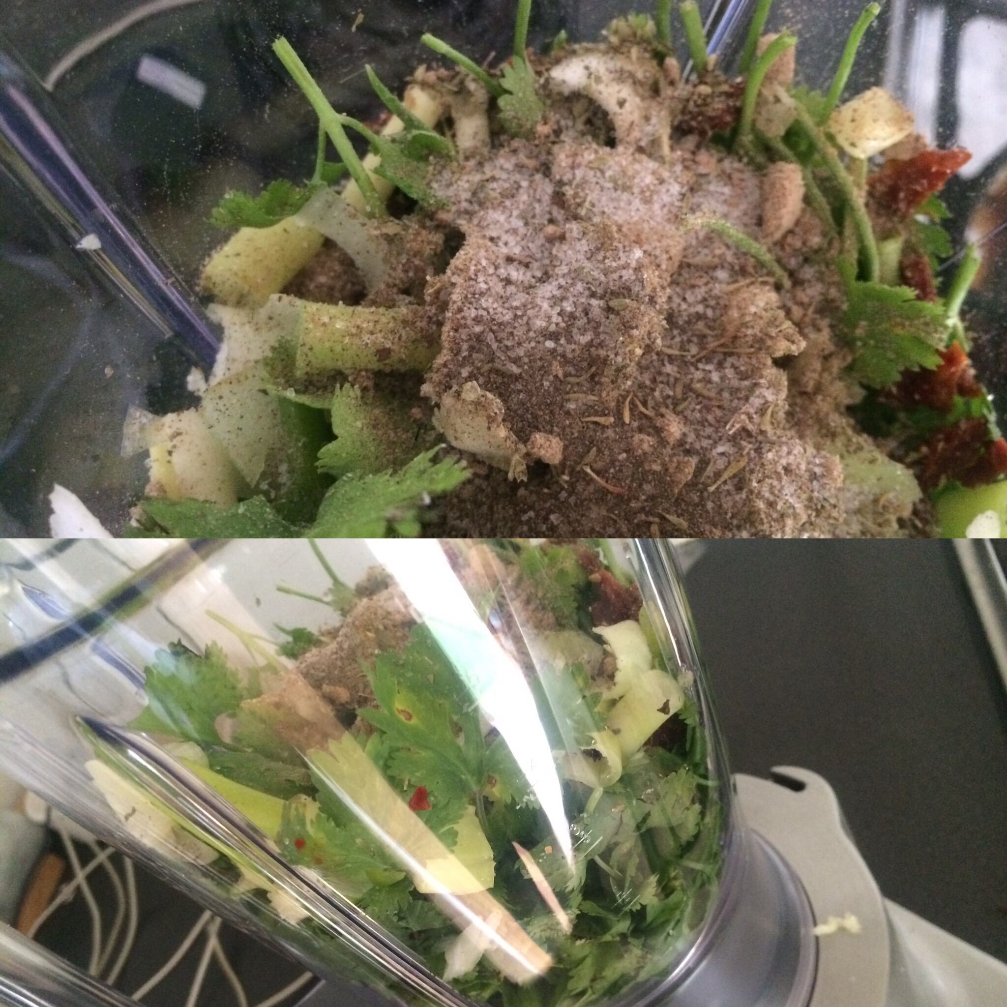Fresh parsley, fresh cilantro/coriander.. Soft garlic, thyme, oregano and cumin.. And a little sundried tomato..