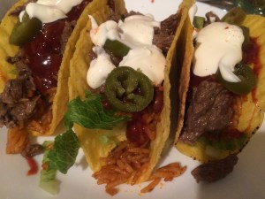 It takes longer to assemble the trimmings! Shredded cos lettuce, green onions.. empty sour cream into a ramekin.. leftover salsa from the last service in the food truck … and a good handful of jalapeños ..