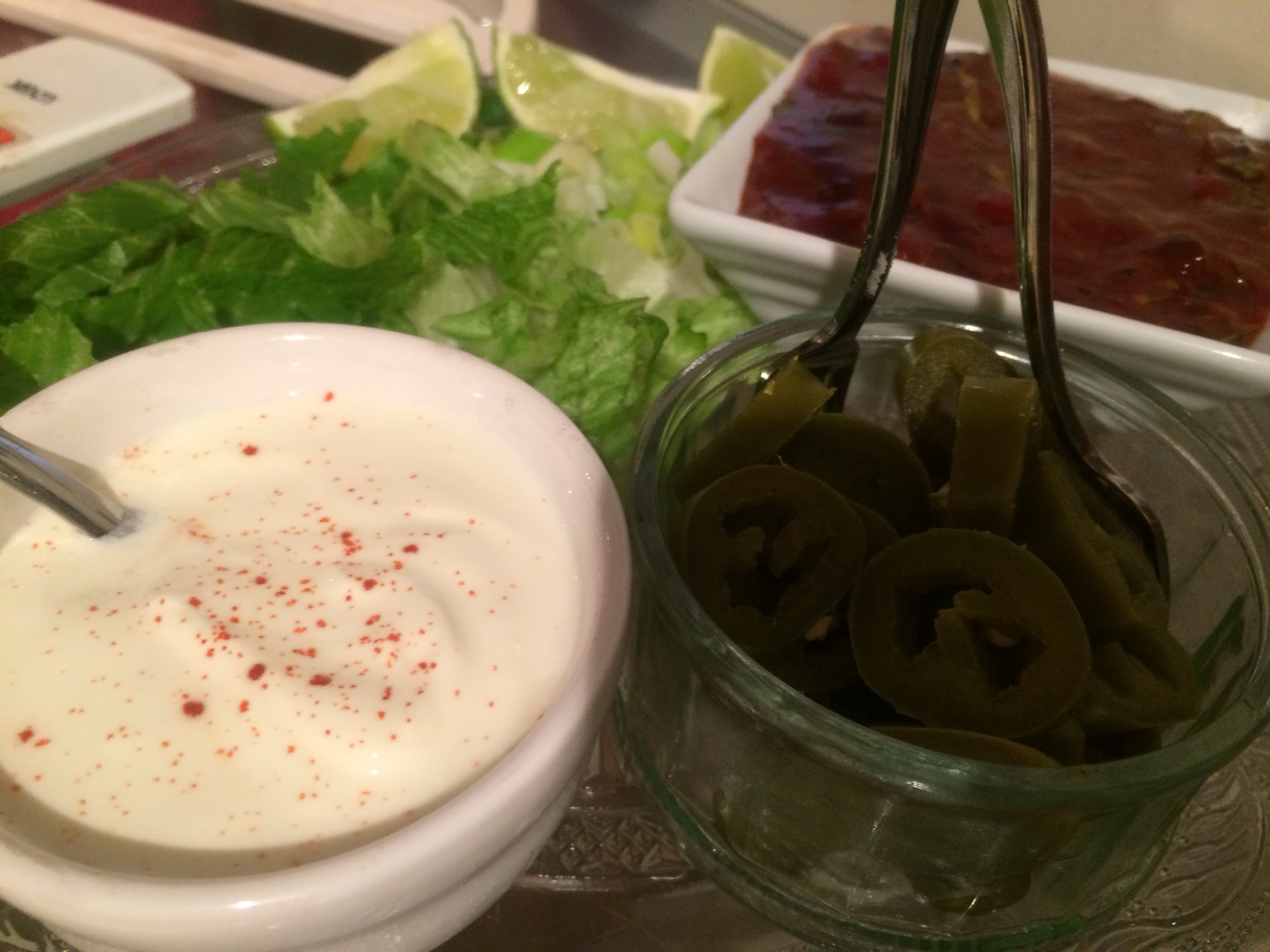 It takes longer to assemble the trimmings! Shredded cos lettuce, green onions.. empty sour cream into a ramekin.. leftover salsa from the last service in the food truck … and a good handful of jalapeños ..