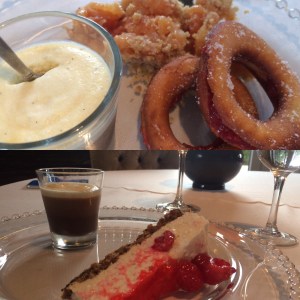 A choc mousse.. a cheese cake.. a crumble.. fresh donuts split and smeared with homemade ham.. and a glass of excellent domaine de sahari white wine!