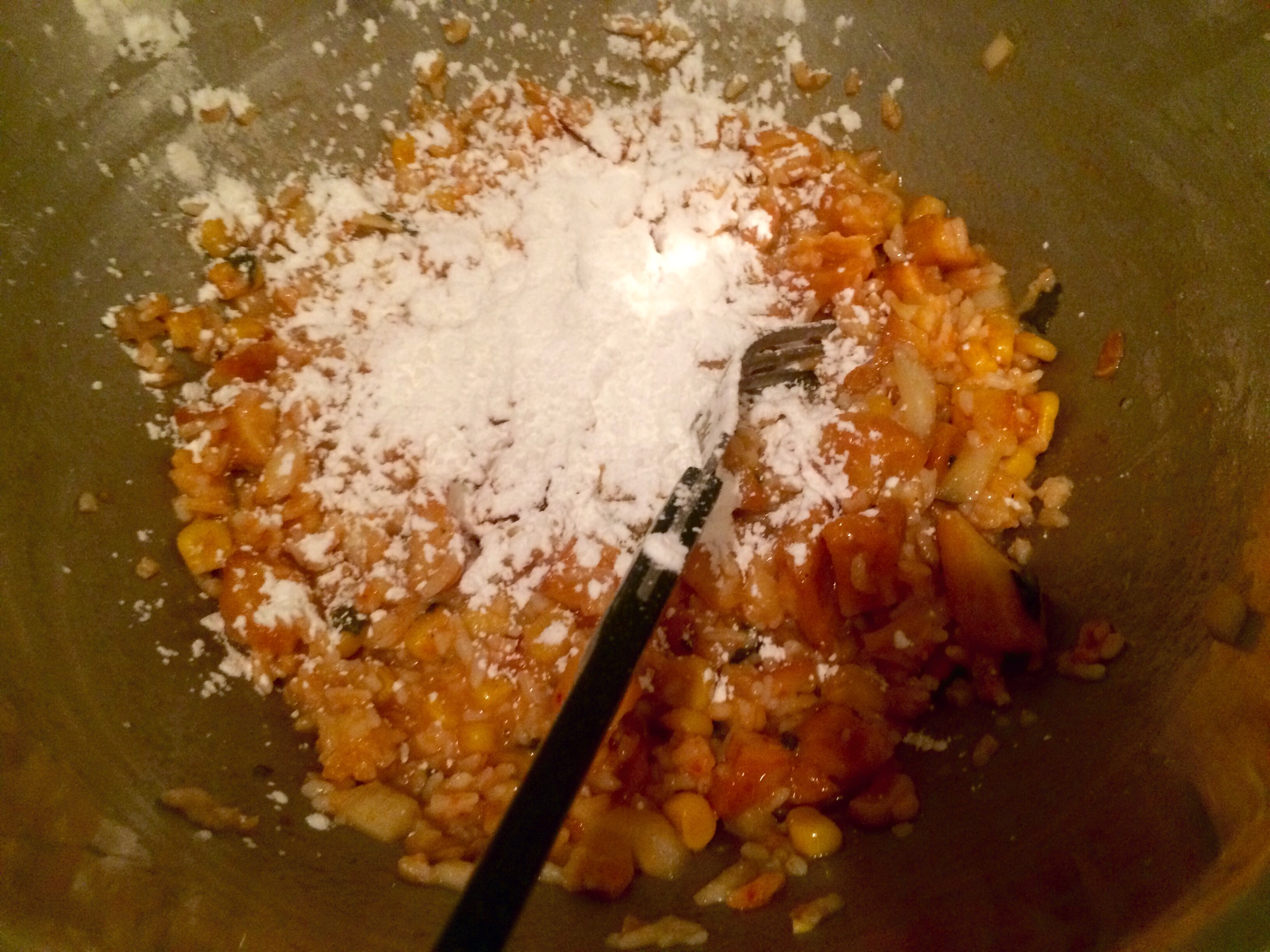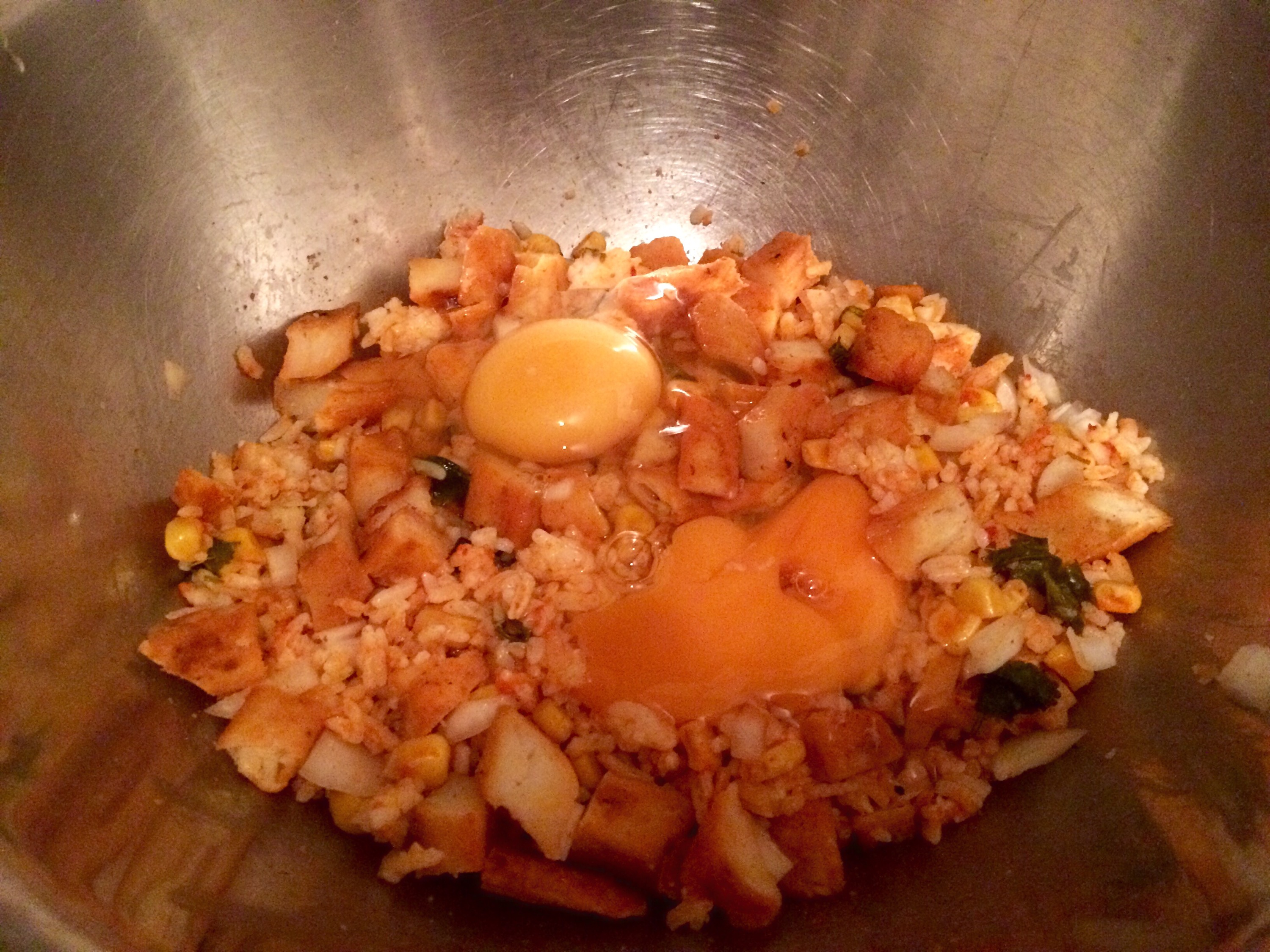 Took the leftover fries and the rice and smushed it all getter with a couple of eggs..adding some cornflour to help..