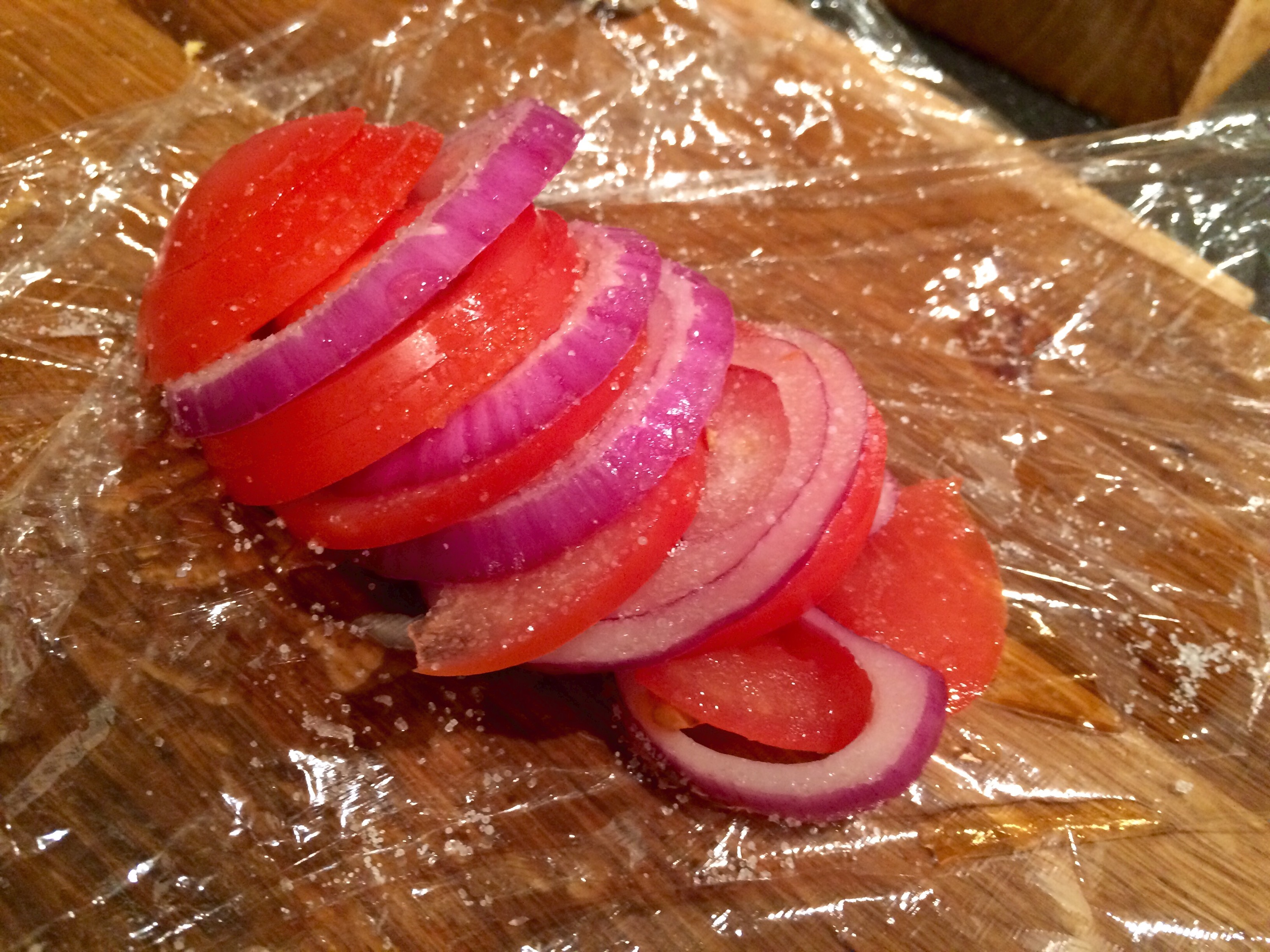 A salady thingy made with just sliced tomatoes and onion.. Dressed with rice vinegar and salt and wrapped up to kinda meld the flavours together.