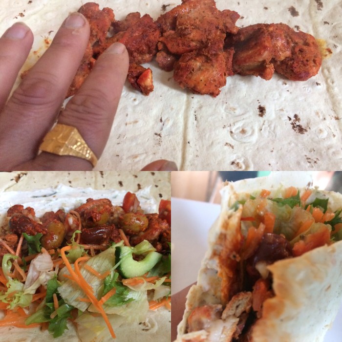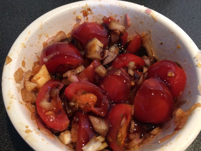 Tikka popped on.. a some tatziki, bought salad leaves dressed in french dressing, a few Turkish marinated olives.. and this neat Spanish tomatoes with shallot, Japanese vinegar and pomegranate sauce..