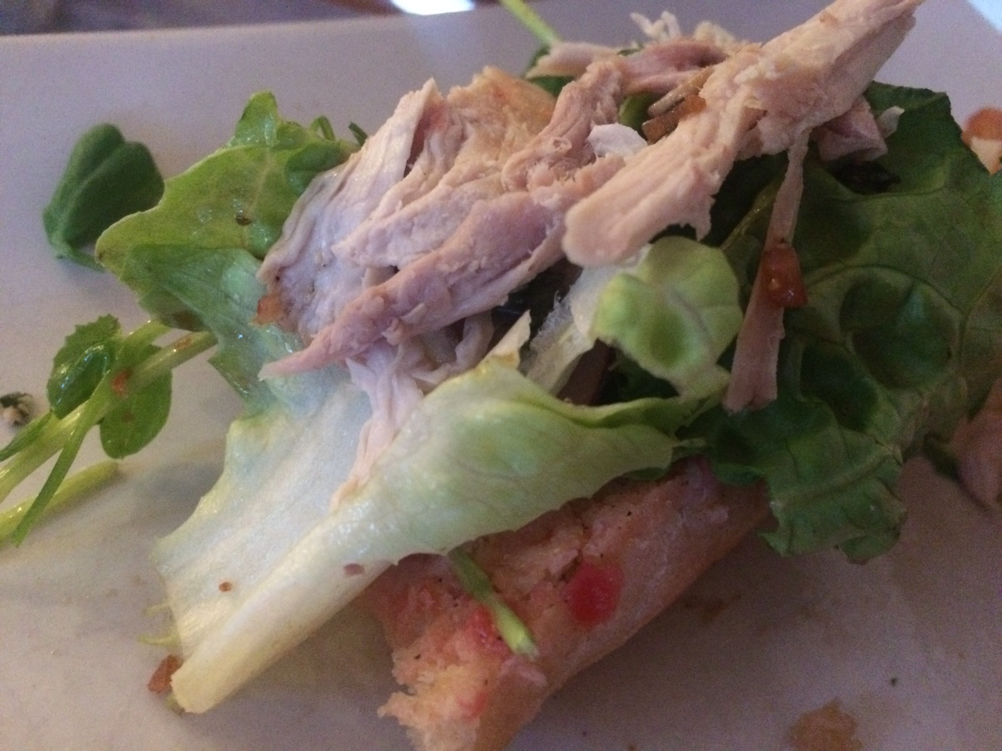 Fantastic tomato bread rubbed with garlic.. pea shoots and lettuces.. and the best poulet noir leftovers ..