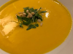 Kicking off with the carrot soup.. sorry! roasted carrot soup with pine nuts and coriander shoots .. and bread..
