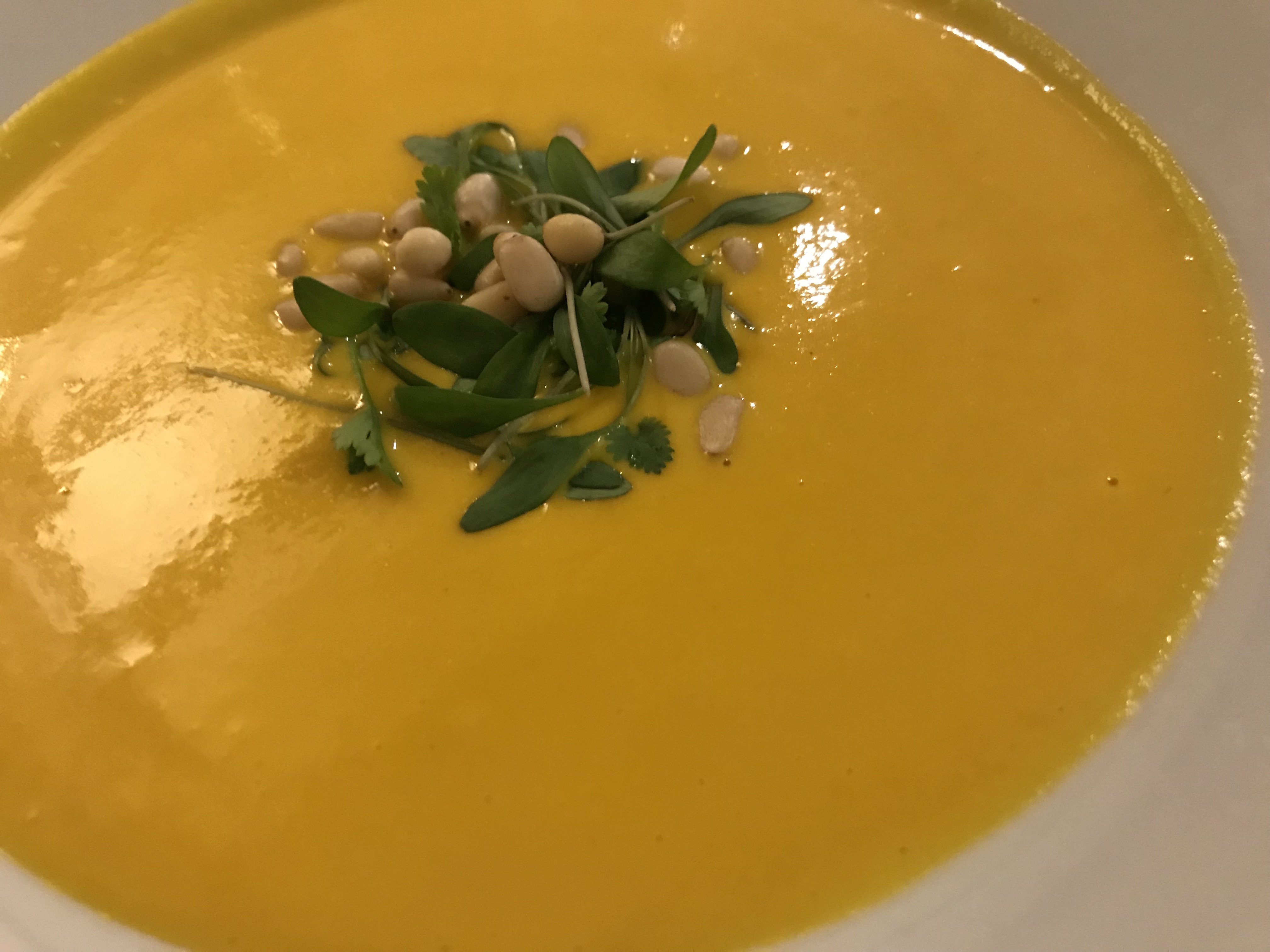 Kicking off with the carrot soup.. sorry! roasted carrot soup with pine nuts and coriander shoots .. and bread..