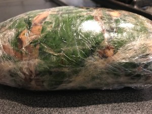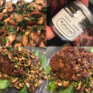 that piece of fillet was browned off .. just a few minutes each rolling side.. cooled and perched on top of more wild garlic leaves and the off the clock fabulous shroom mix..